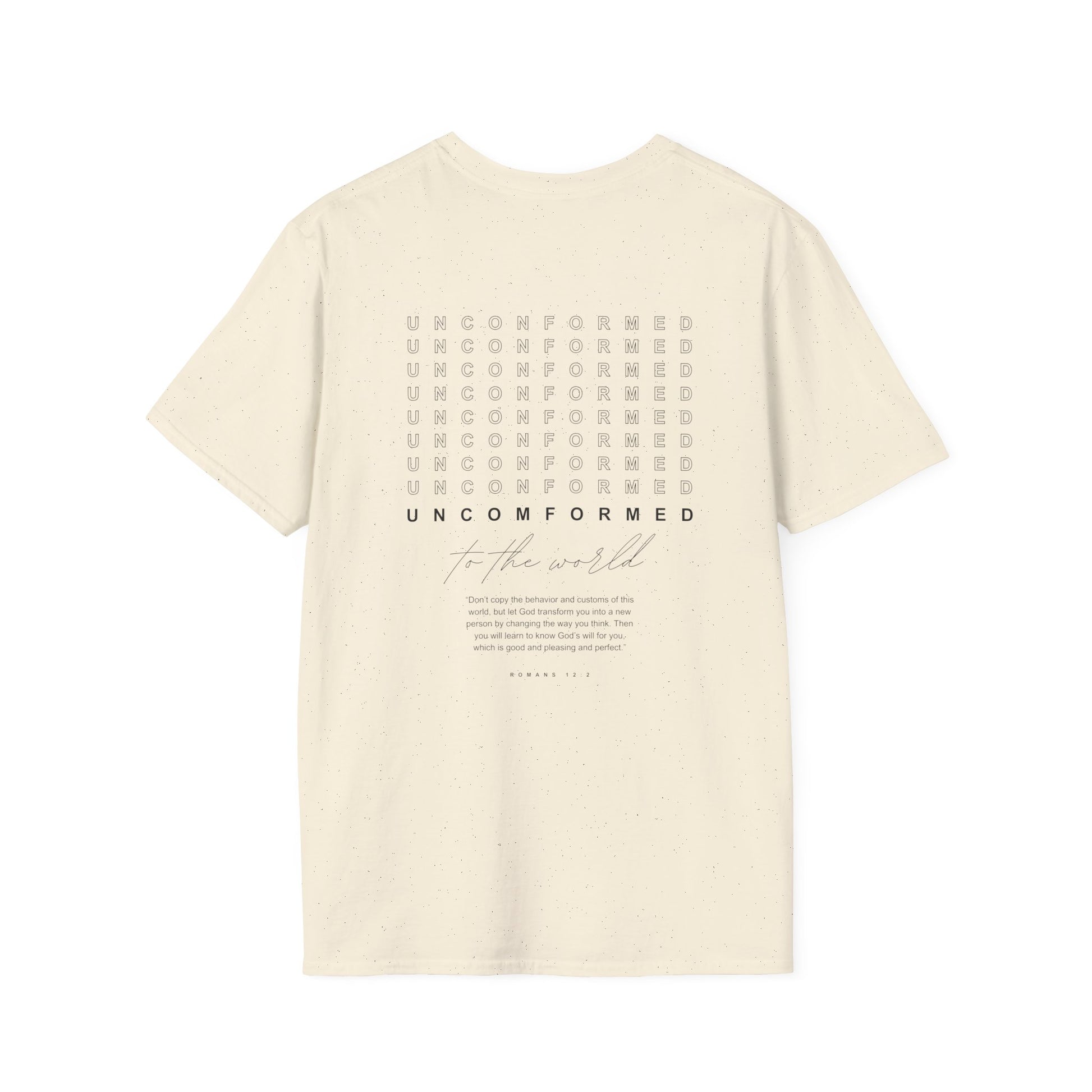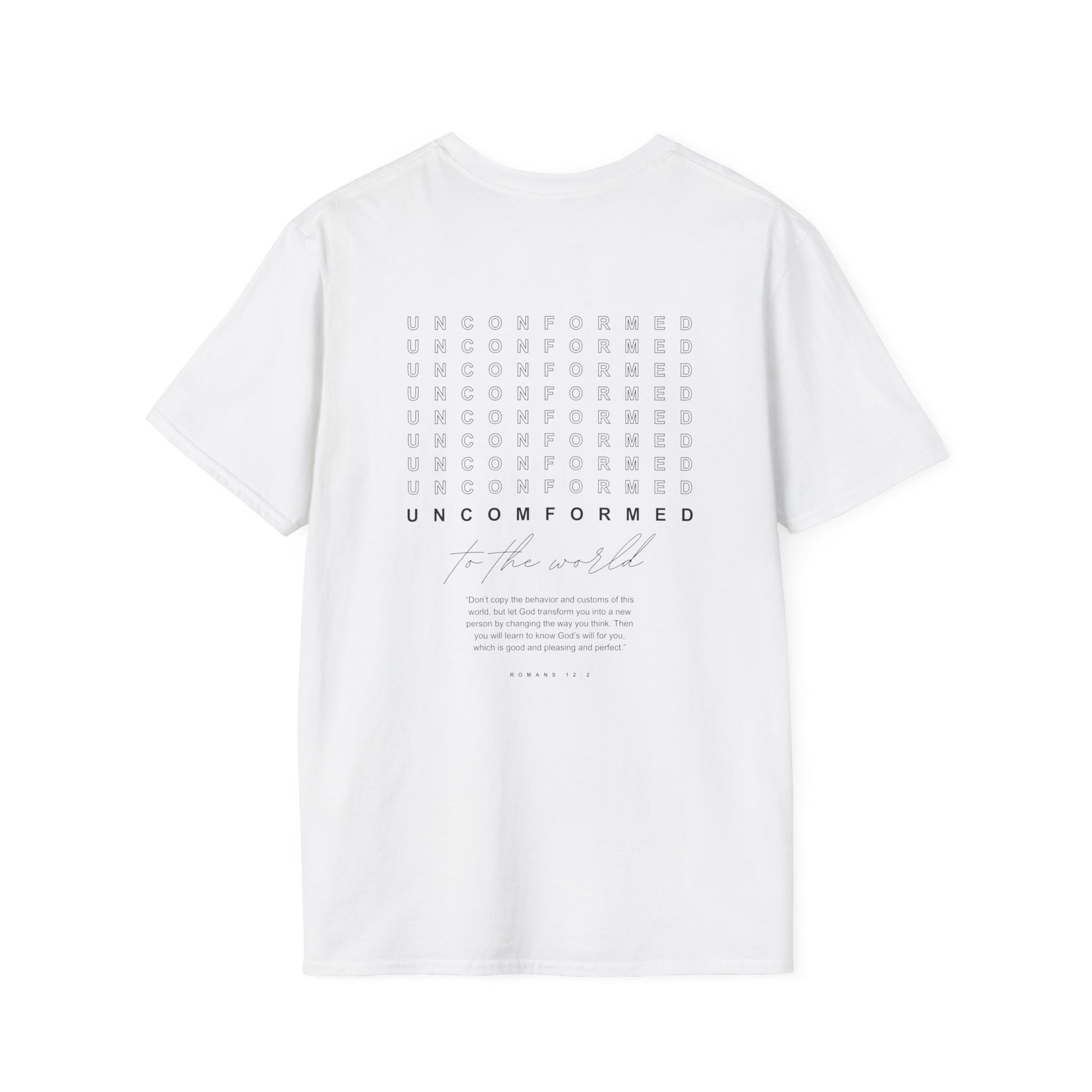 Stand firm in your faith and boldly declare your identity in Christ with the “Unconformed to the World” T-shirt. Inspired by Romans 12:2 (KJV): “And be not conformed to this world: but be ye transformed by the renewing of your mind…”, this shirt is a powerful reminder to resist the pressures of the world and live transformed by God’s truth.